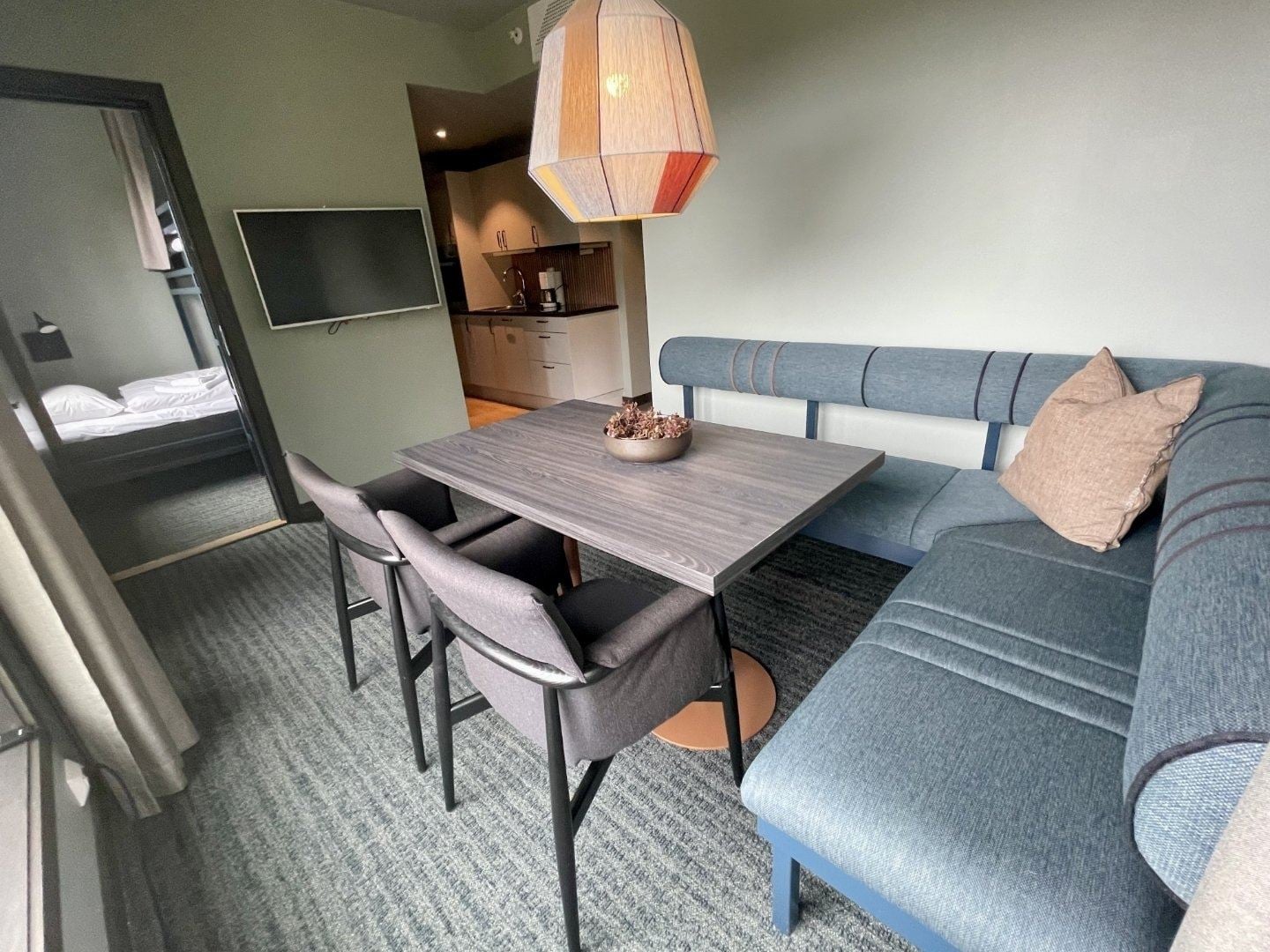 Familierom med to soverom, pentry og sittegruppe