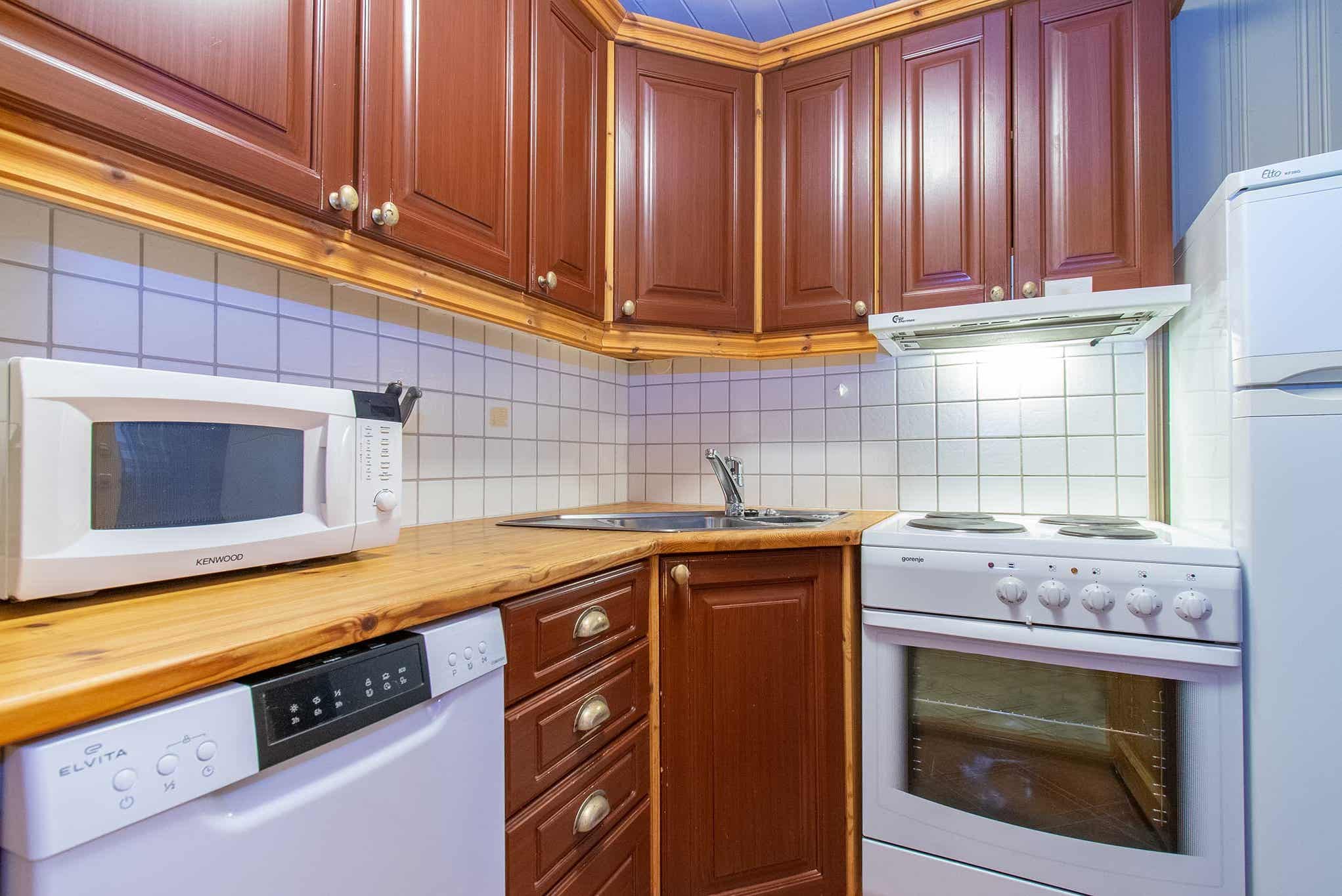 Enheden har mikrobølgeovn, opvaskemaskine, køleskab, fryser.