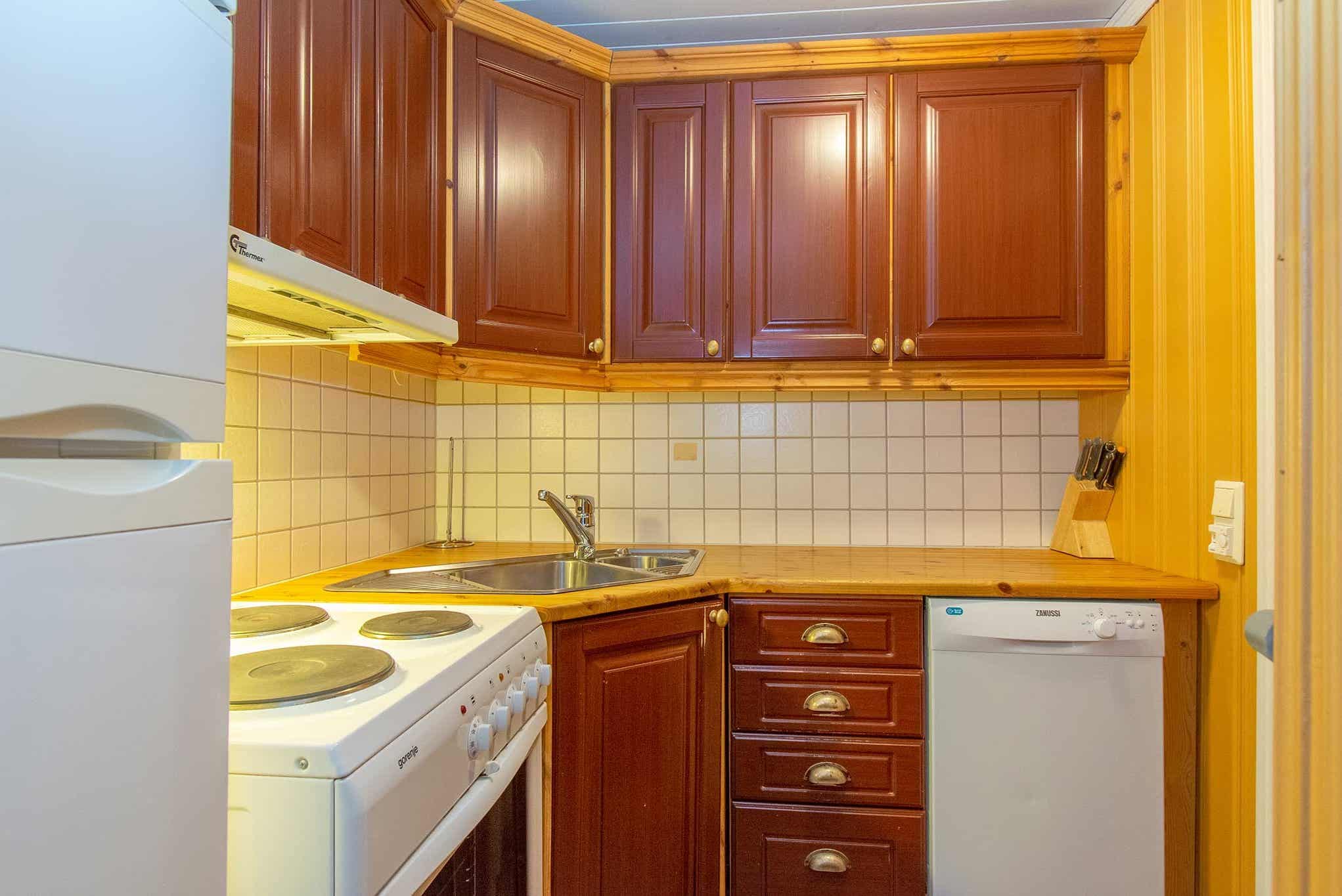 Enheden har mikrobølgeovn, opvaskemaskine, køleskab, fryser.