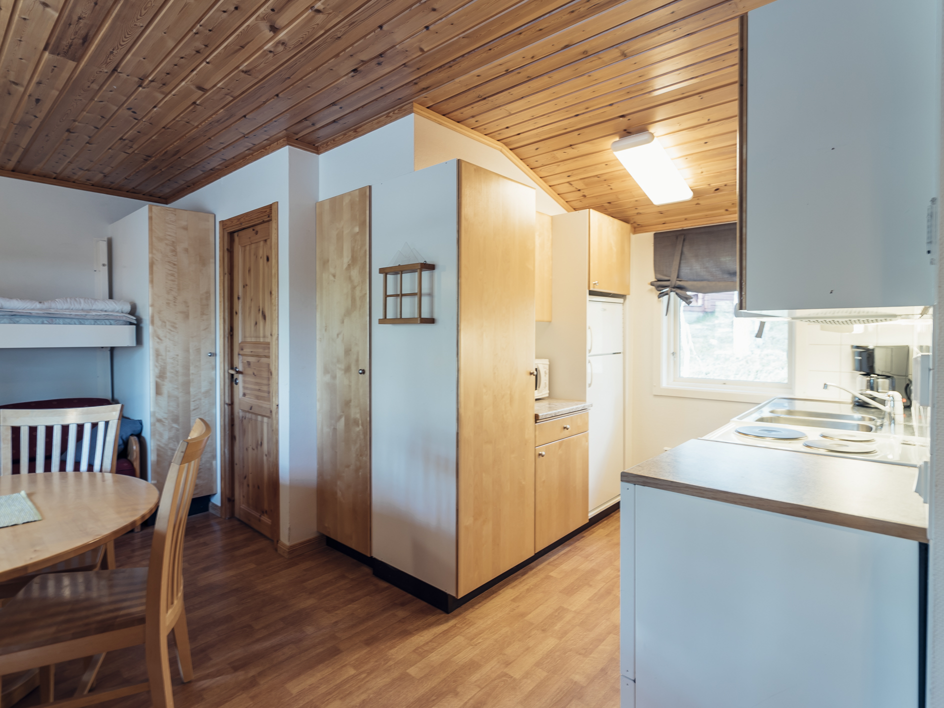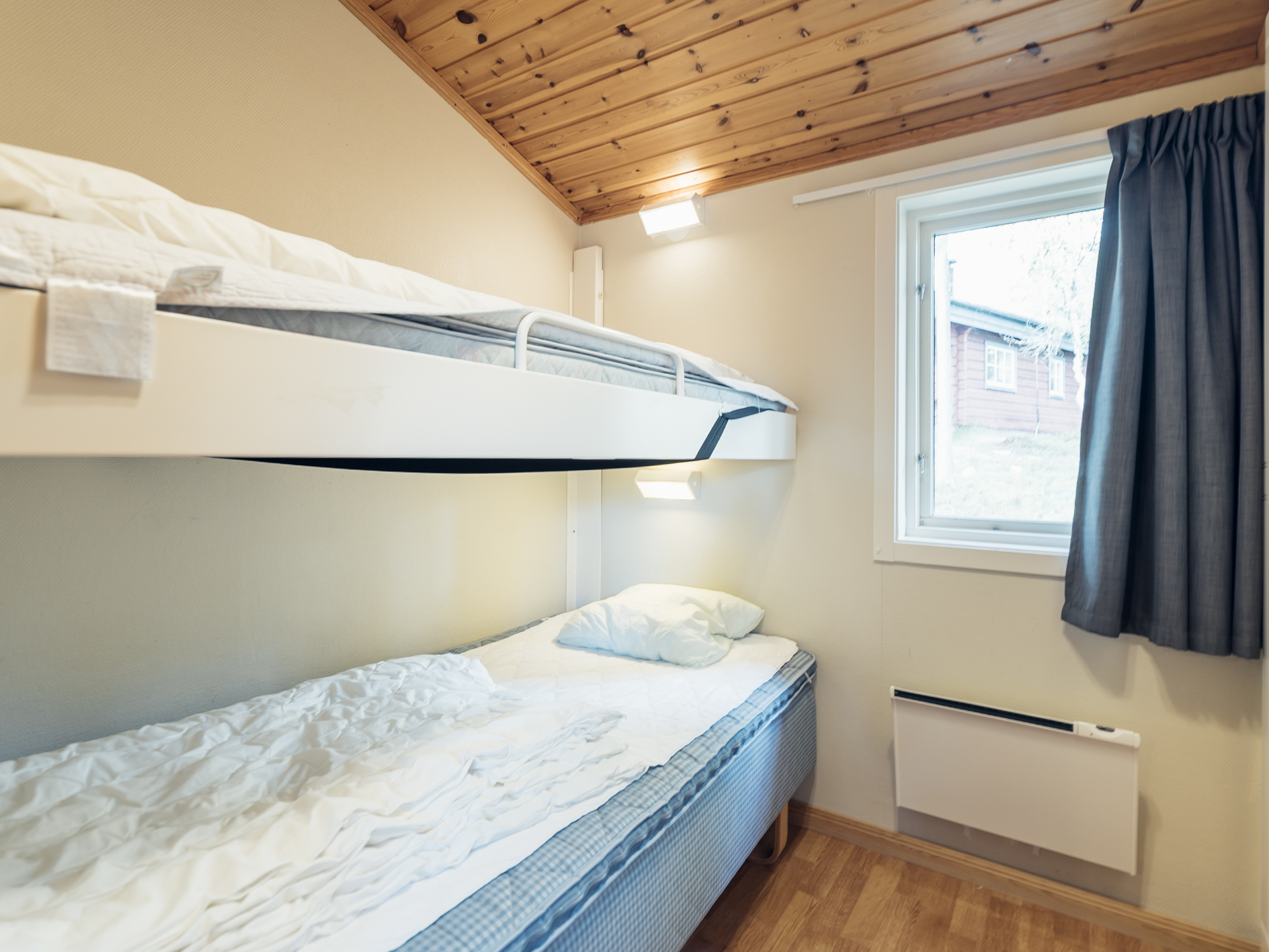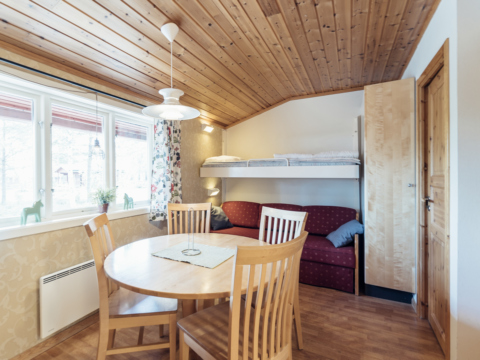 Mindre parhus i Skogsbyn med plats för upp till 5 personer. Här är det en öppen planlösning med köksavdelning, matplats, TV - hörna med bäddsoffa för 2 personer och en nedfällbar väggsäng. Sovrum 1 har en enkelsäng och en nedfällbar väggsäng. Torkskåp och motorvärmaruttag. Rökning och husdjur är ej tillåtet. Laddning av elbilar är endast tillåtet vid avsedda laddningsstolpar. Boendet håller en enklare standard.