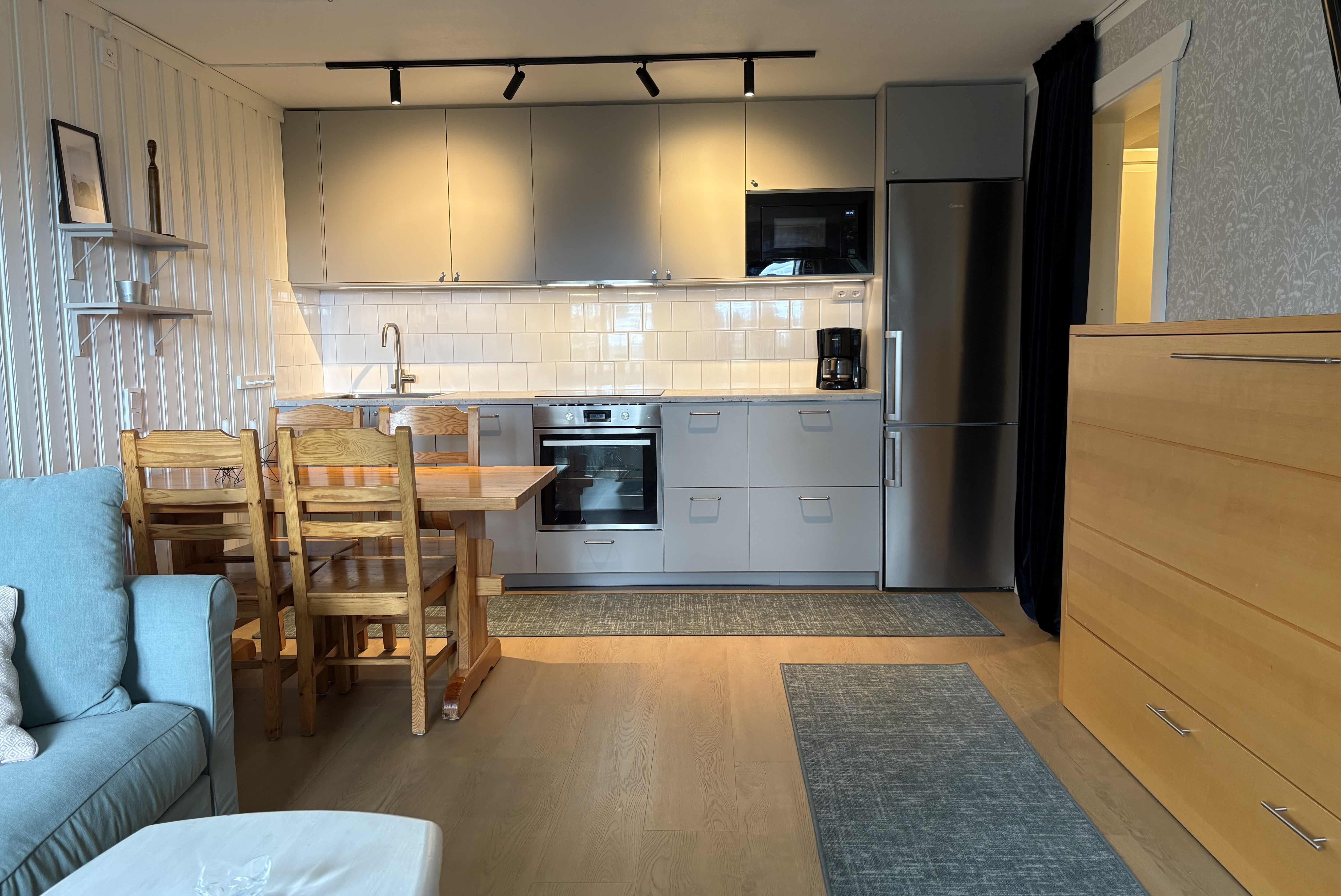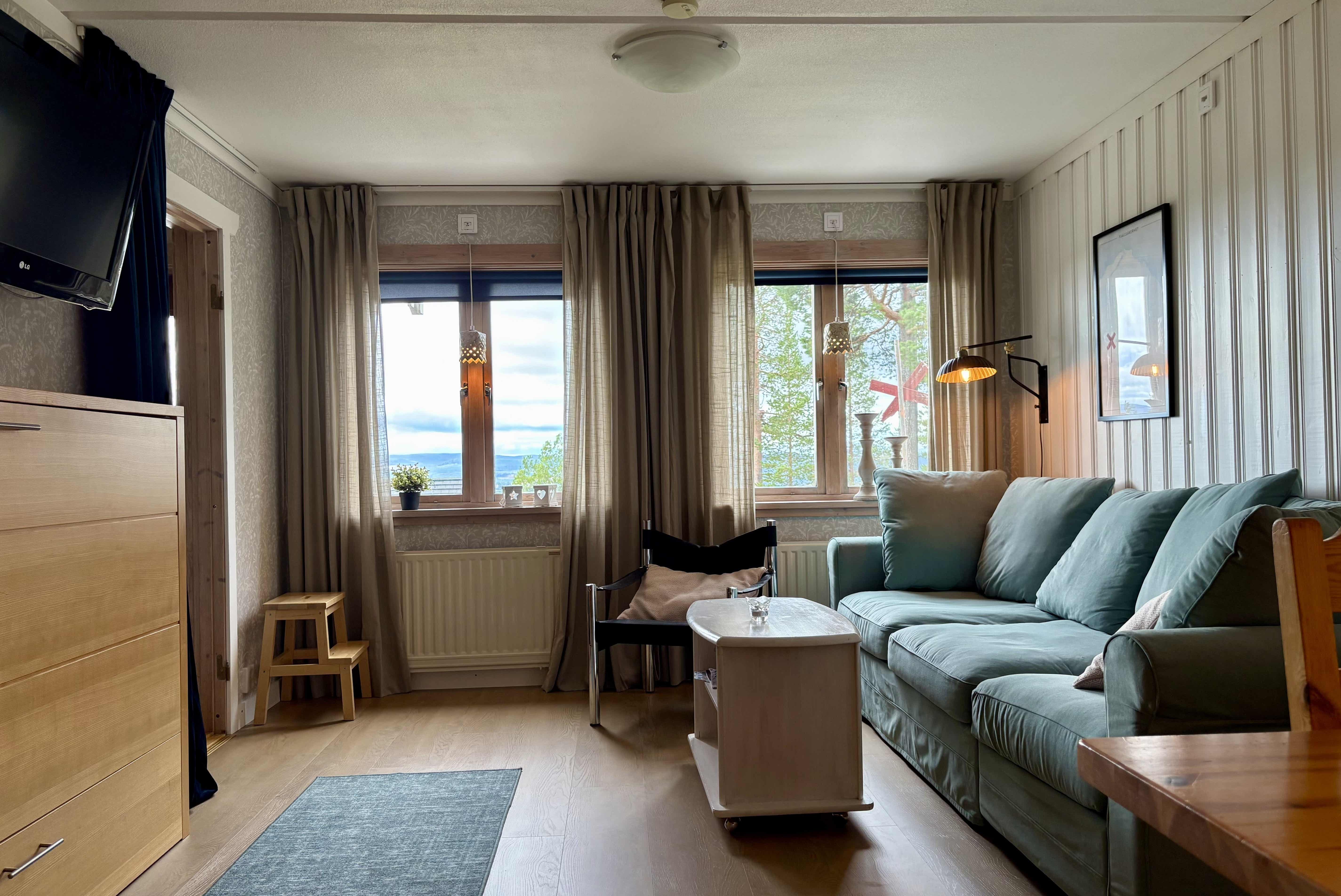 Stue med lille køkkenafdeling, TV, sovesofa 140 cm bred, skabssenge, med 1 plads.