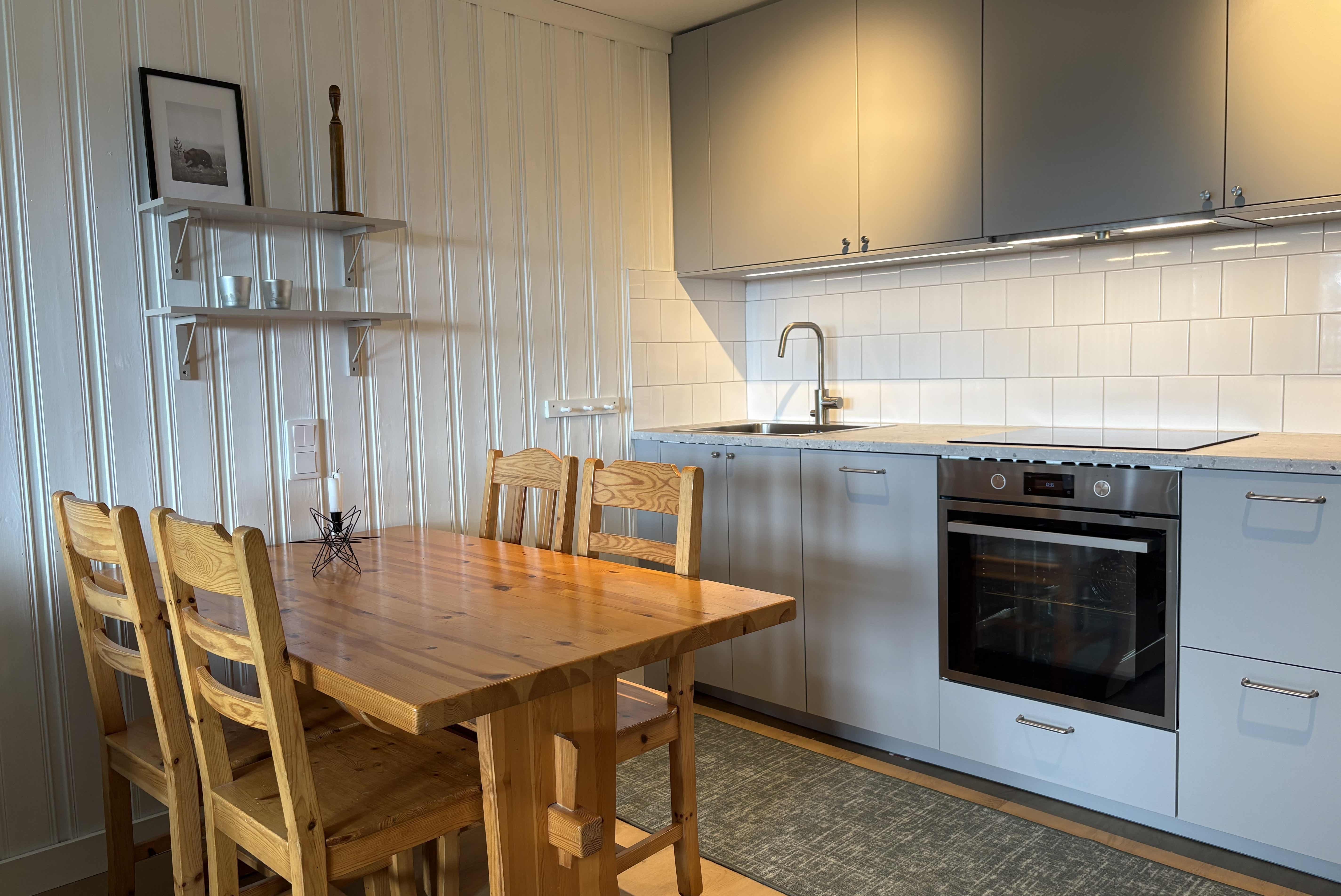 Køkkenet indeholder komfur med ovn, køleskab og fryser, opvaskemaskine, mikro.