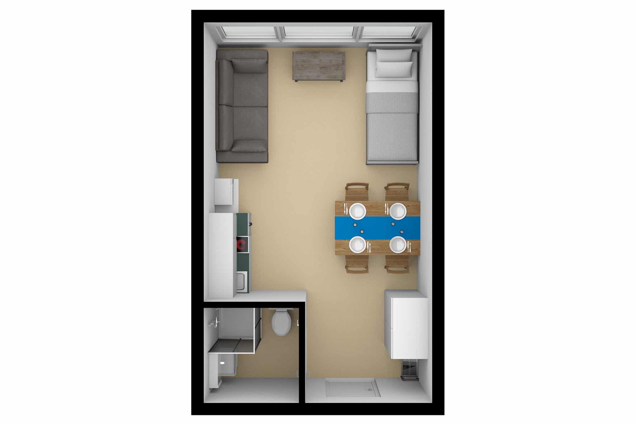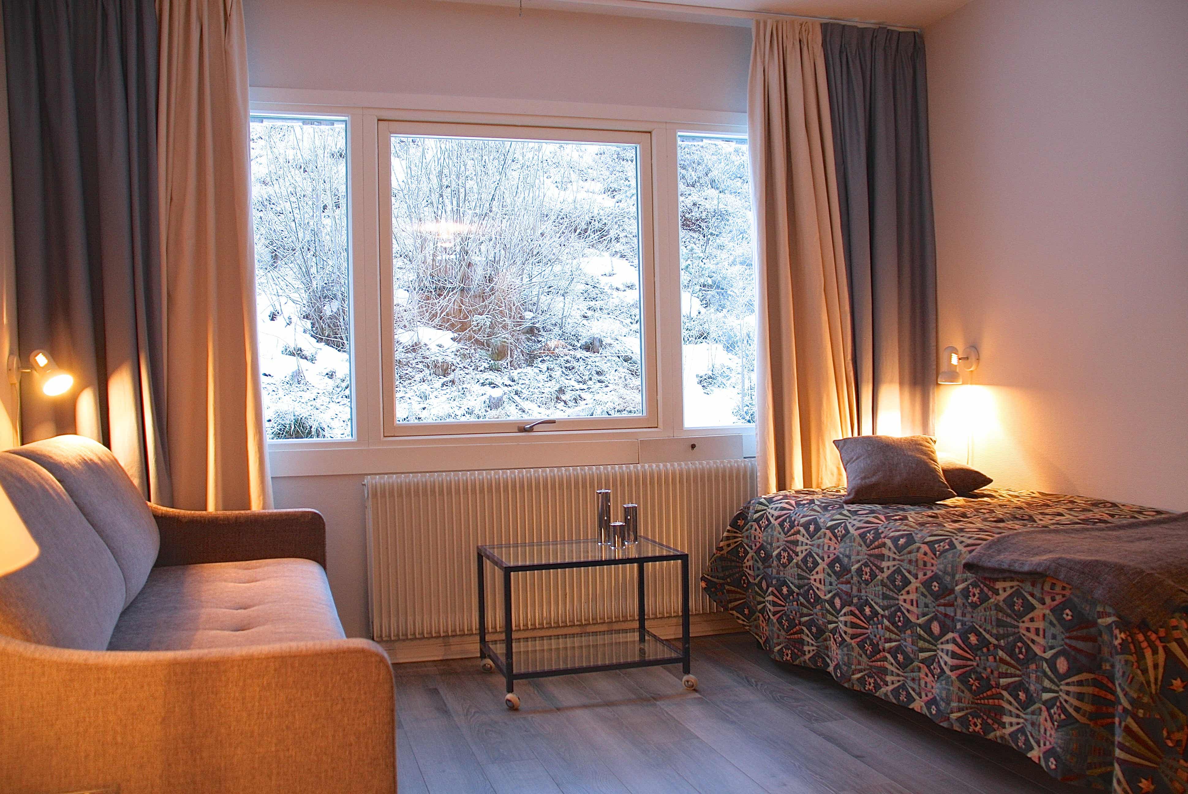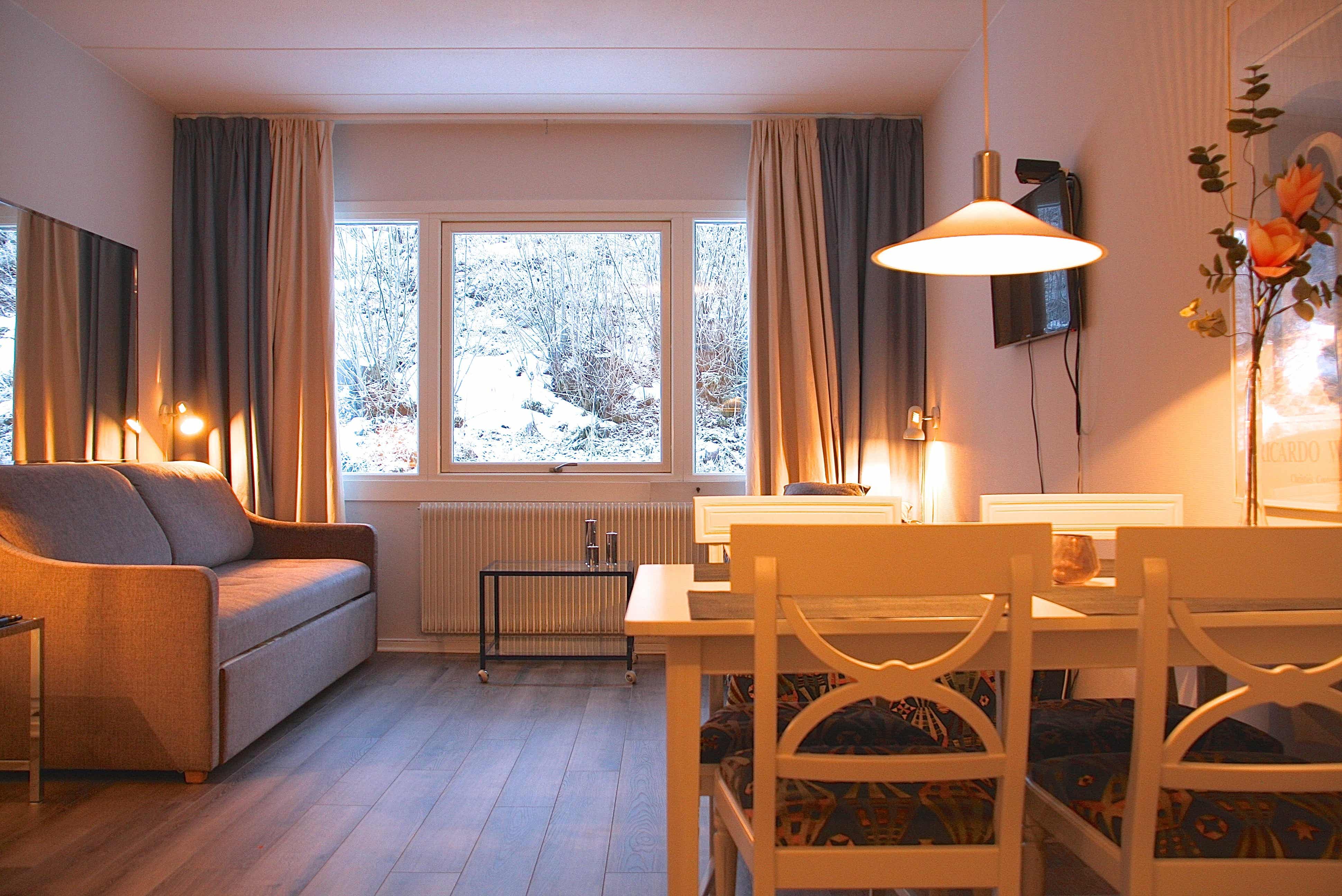 Stue med TV, 1 enkeltseng, sovesofa til 2 personer, kombinerad sov och köksavdelning.