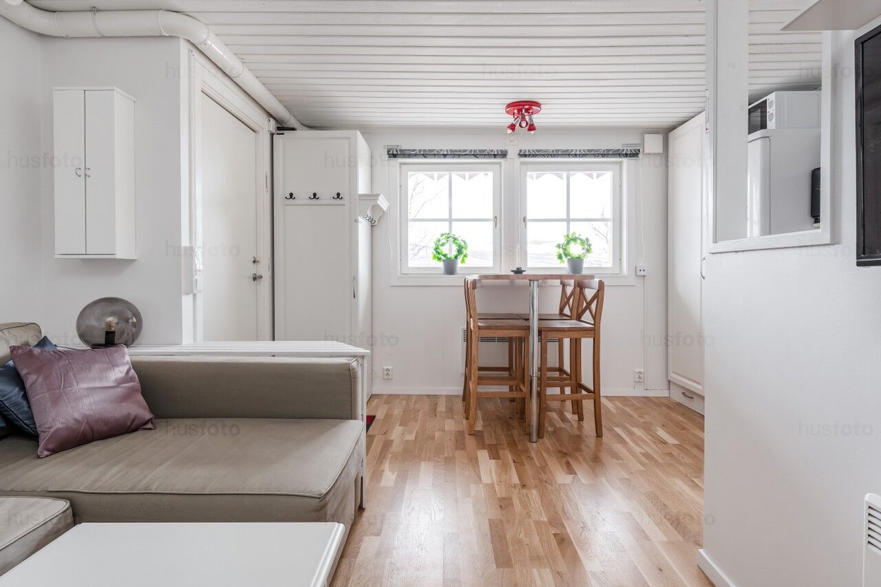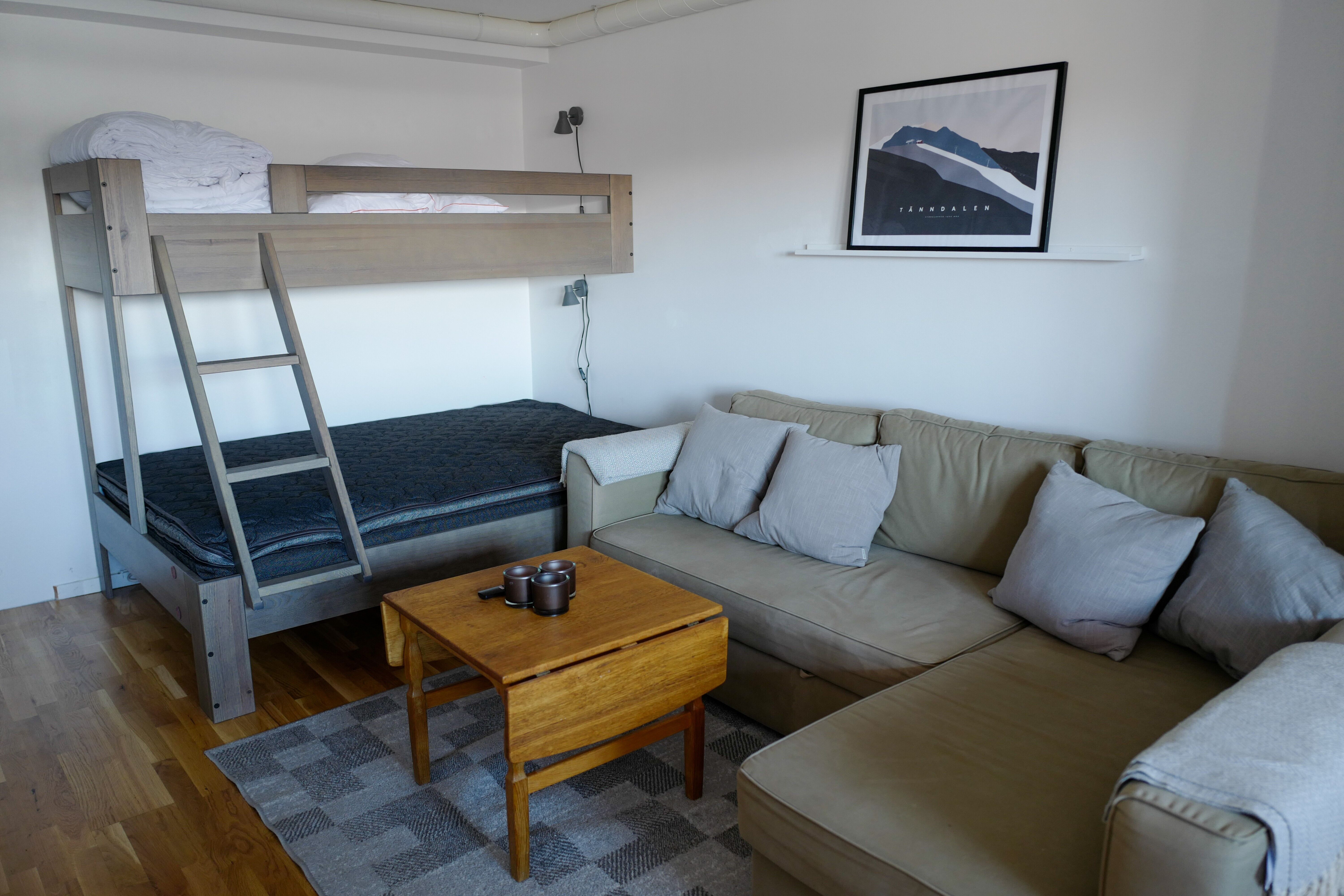 Öppen planlösning med soffa (möjlighet till 2 bäddar), TV, matplats och våningssäng med bredare underslaf (80/120cm).