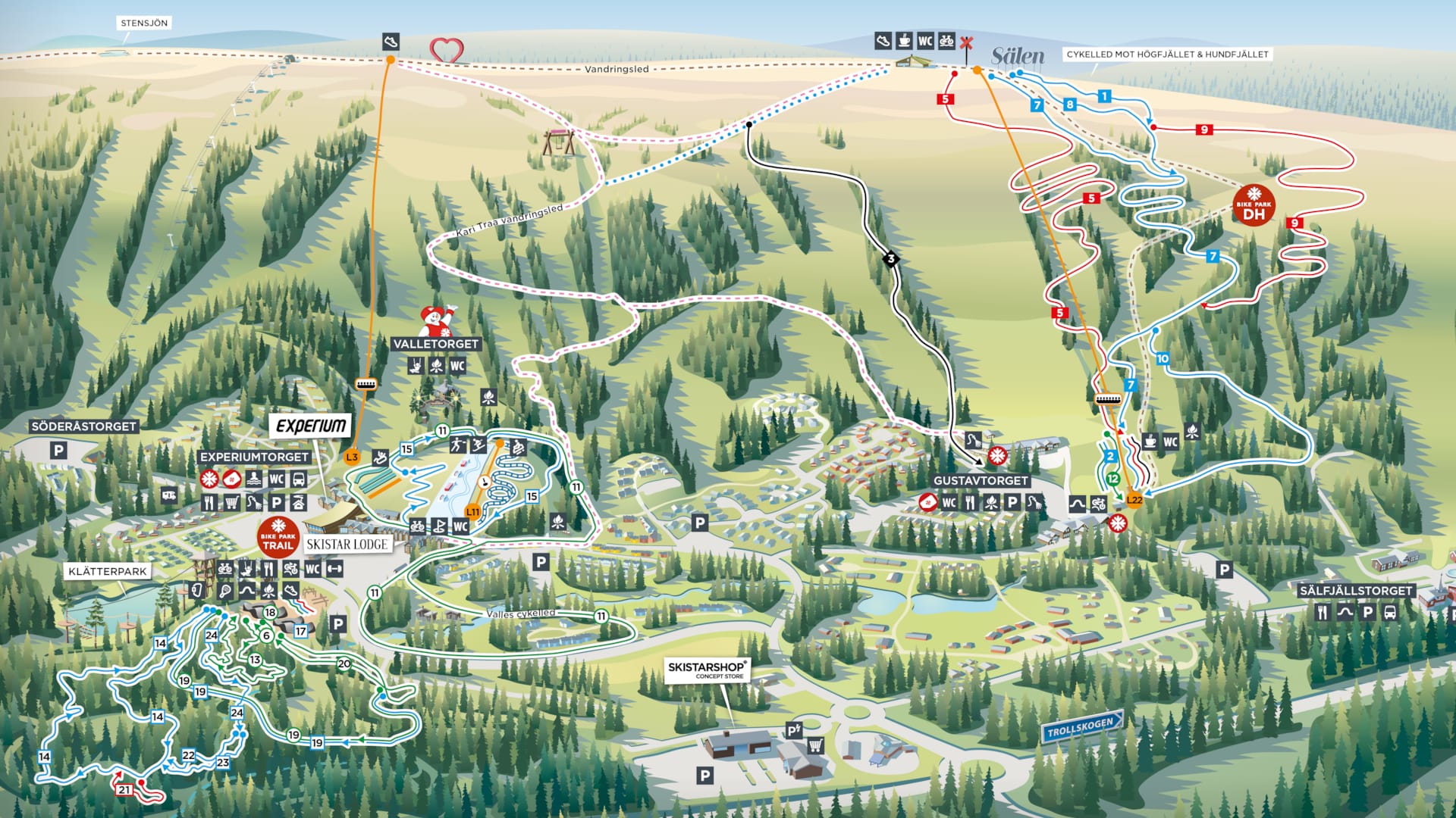 Alle XC-stier udgår fra samlingspunktet ved Experiumtorget. Det er muligt at tage liften op på fjeldet og prøve fjeldcykling, som er en anden type XC-cykling. Alle vores strækninger i Lindvallen indgår i Bikingdalarna og har samme slags skiltning. Du kan finde flere stier i nærområdet på bikingdalarna.se.