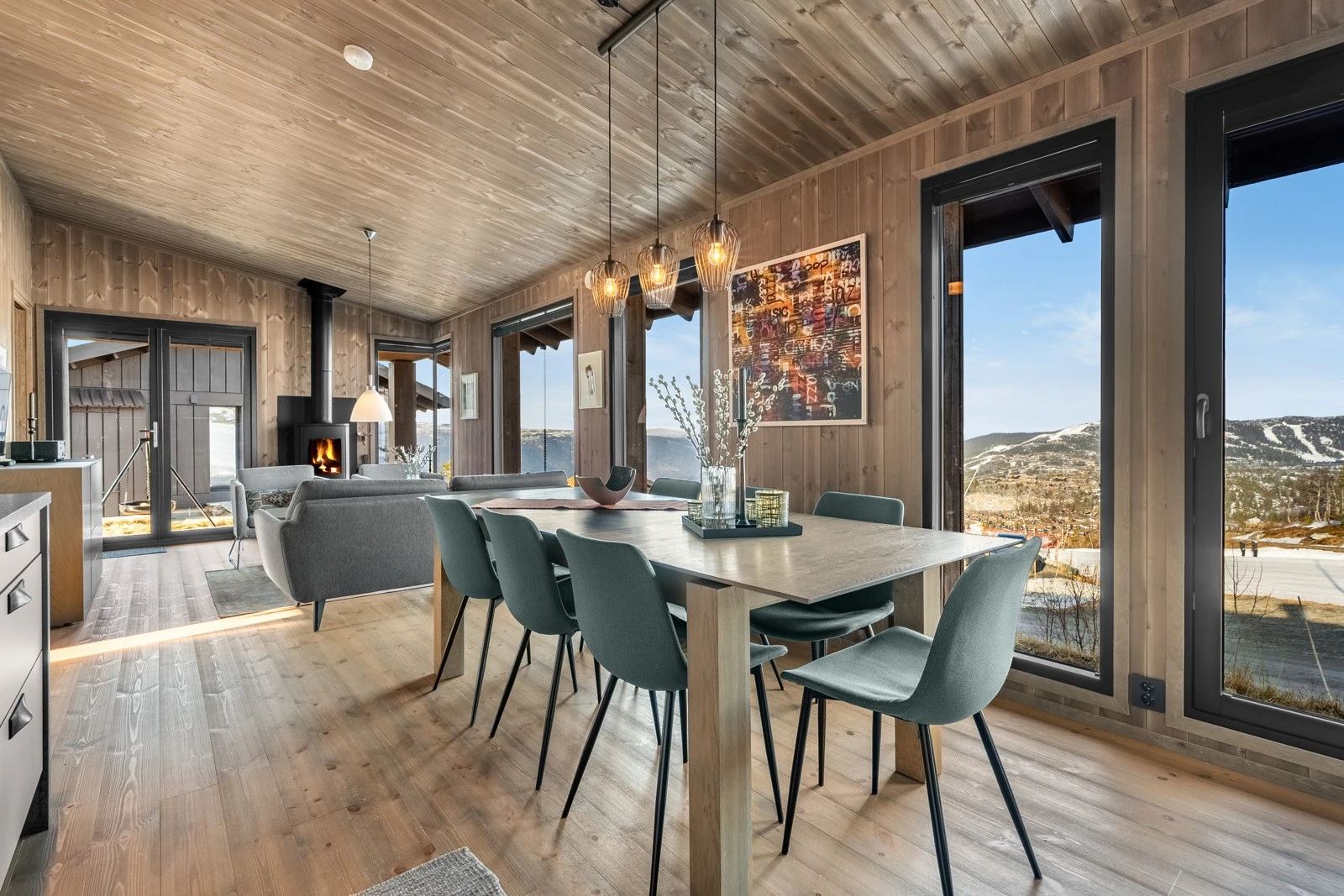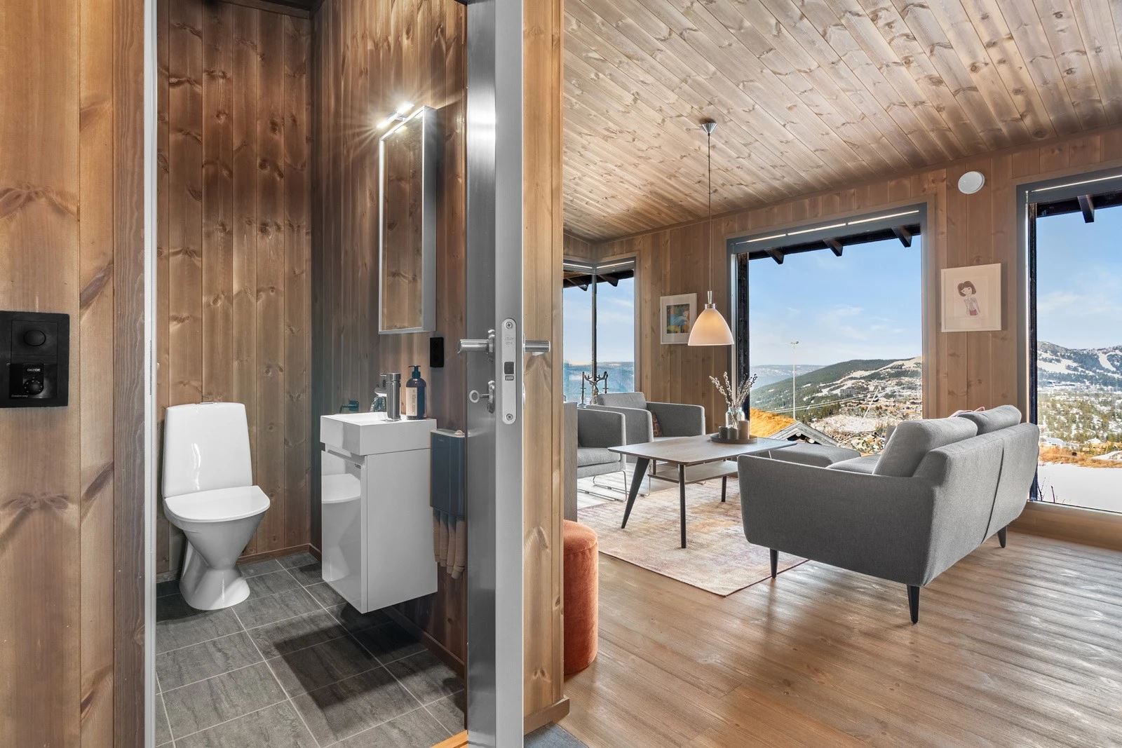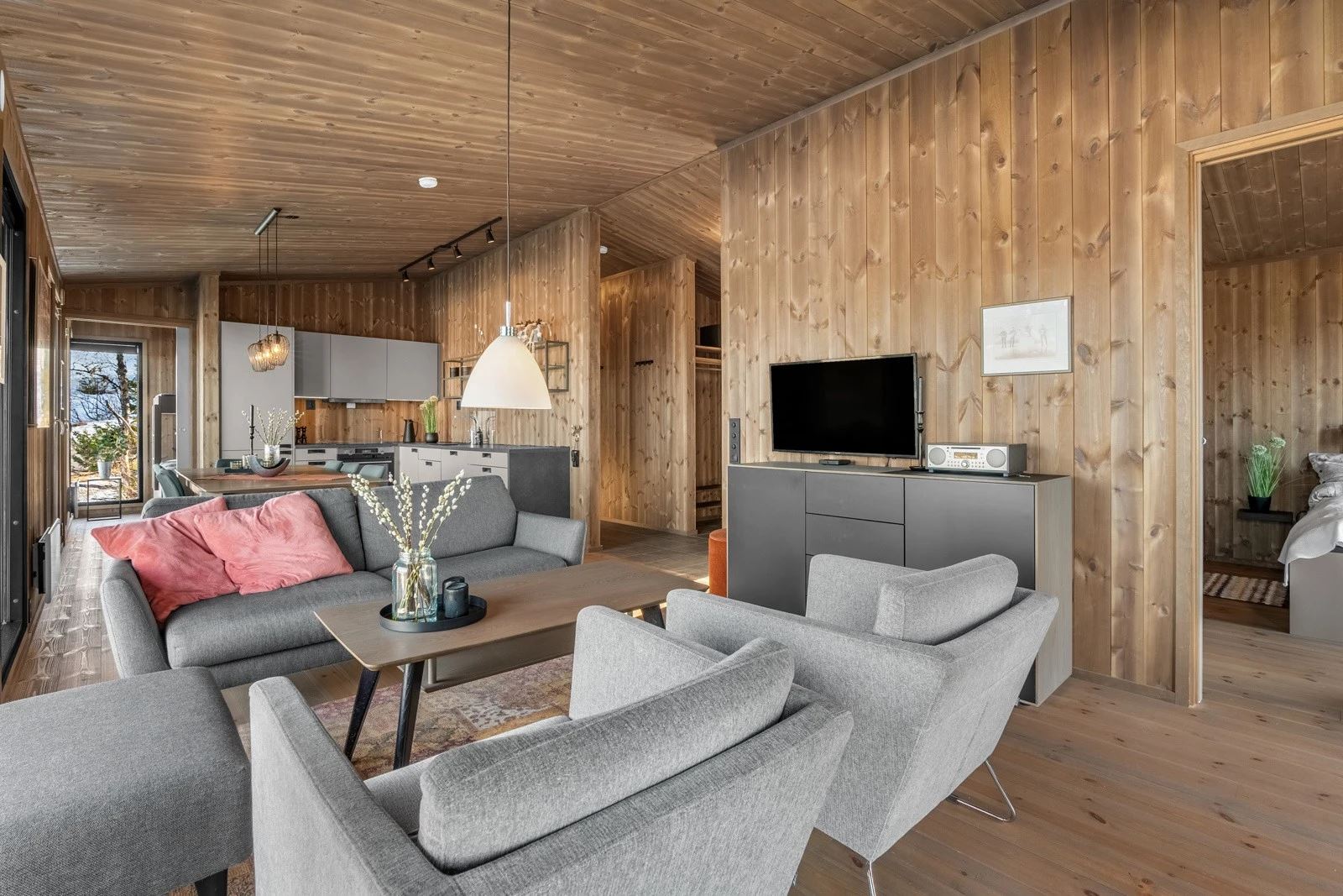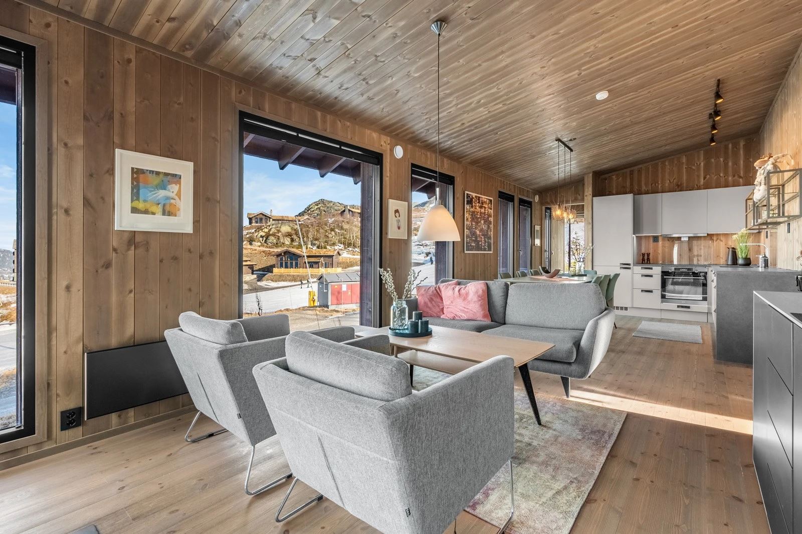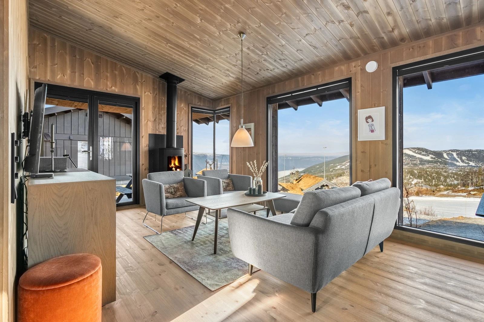 Moderne hytte med 4 soverom for opptil 9 gjester. Åpen stue og kjøkkenløsning med peis og store vinduer med panoramautsikt mot Gaustatoppen og Gausta Skisenter. TV og Wi-Fi*
