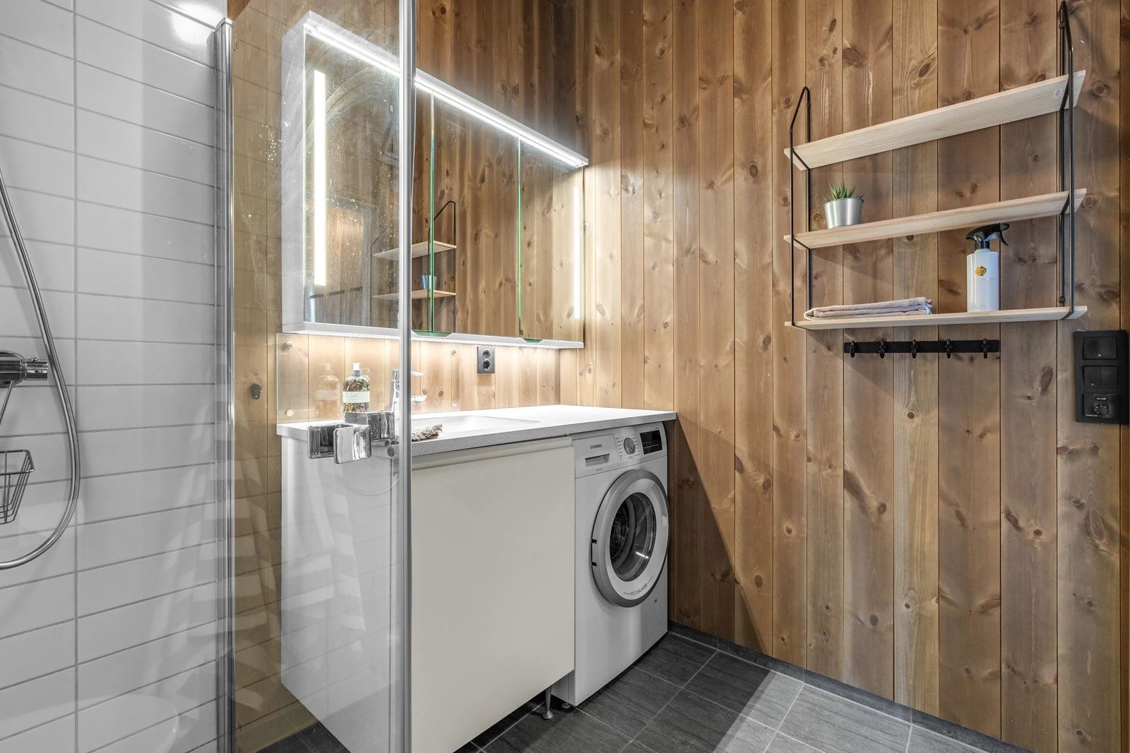 Bad med dusj, WC og vaskemaskin + ett separat WC. Terrasse og uteområde rundt hytten.