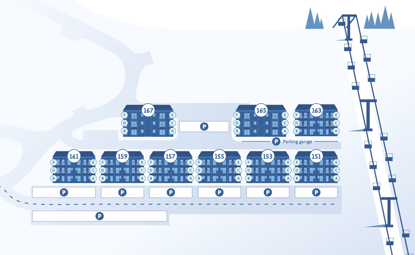 Denne leiligheten har én parkeringsplass i parkeringsgarasjen. Utover dette må man parkere på parkeringsplass P3 nedenfor Skistua.