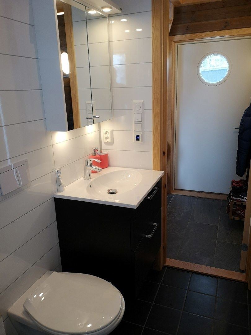 Hytta har kombinert stue og kjøkken, bad med dusj, wc og varmekabler i alle gulv.