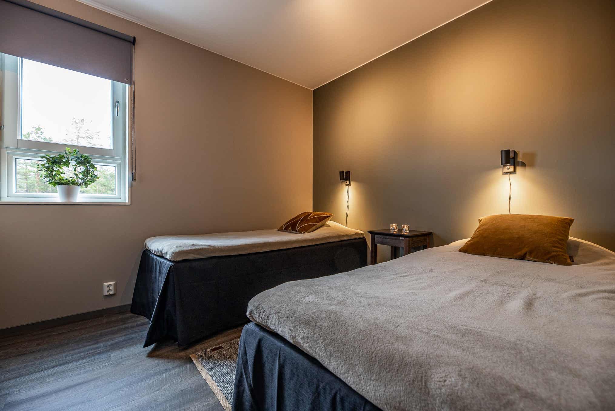 Soveværelse-1= 1 dobbeltseng 180 cm bred. Soveværelse-2= 2 enkeltsenge 90 cm bred. Soveværelse-3= 1 køjeseng.