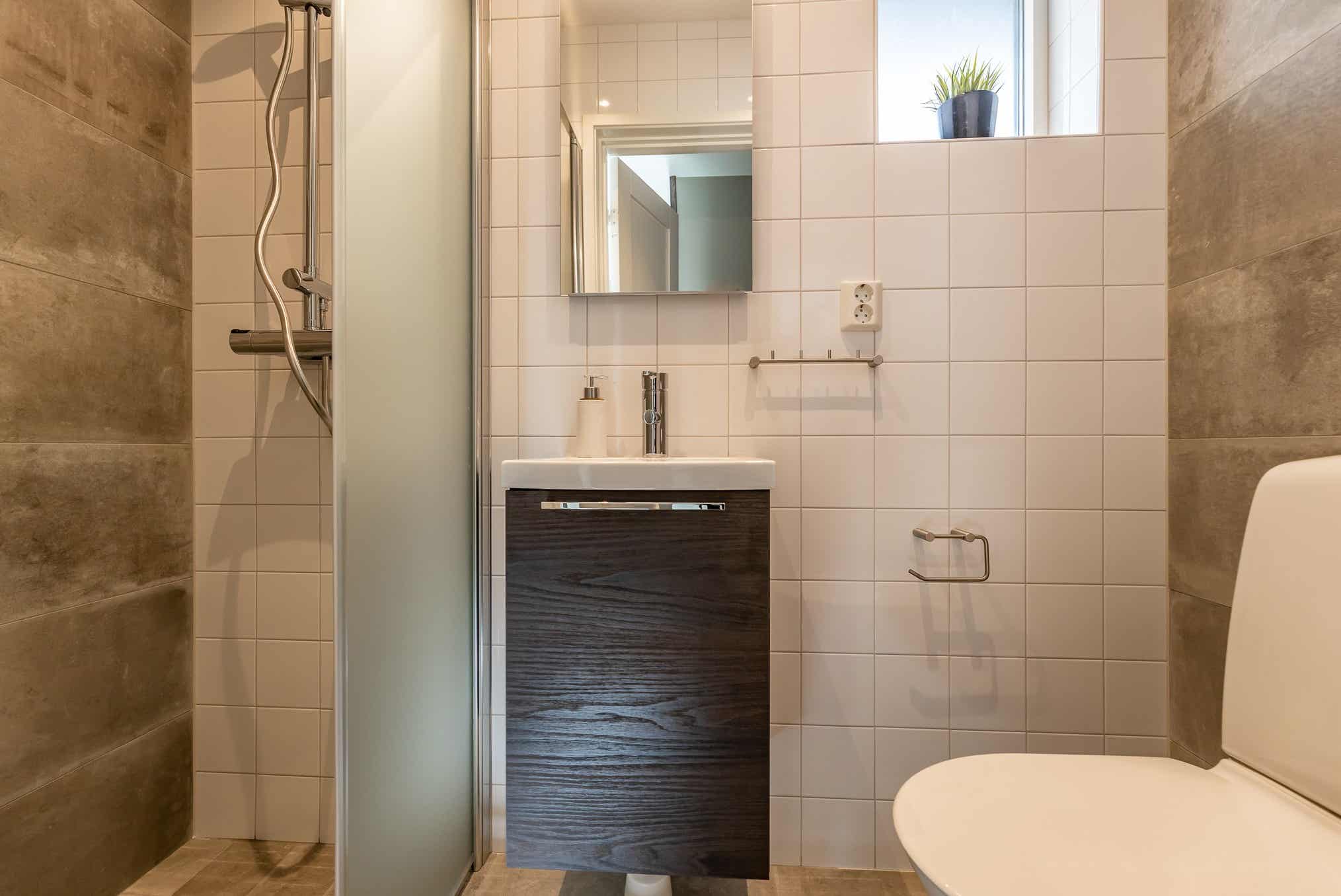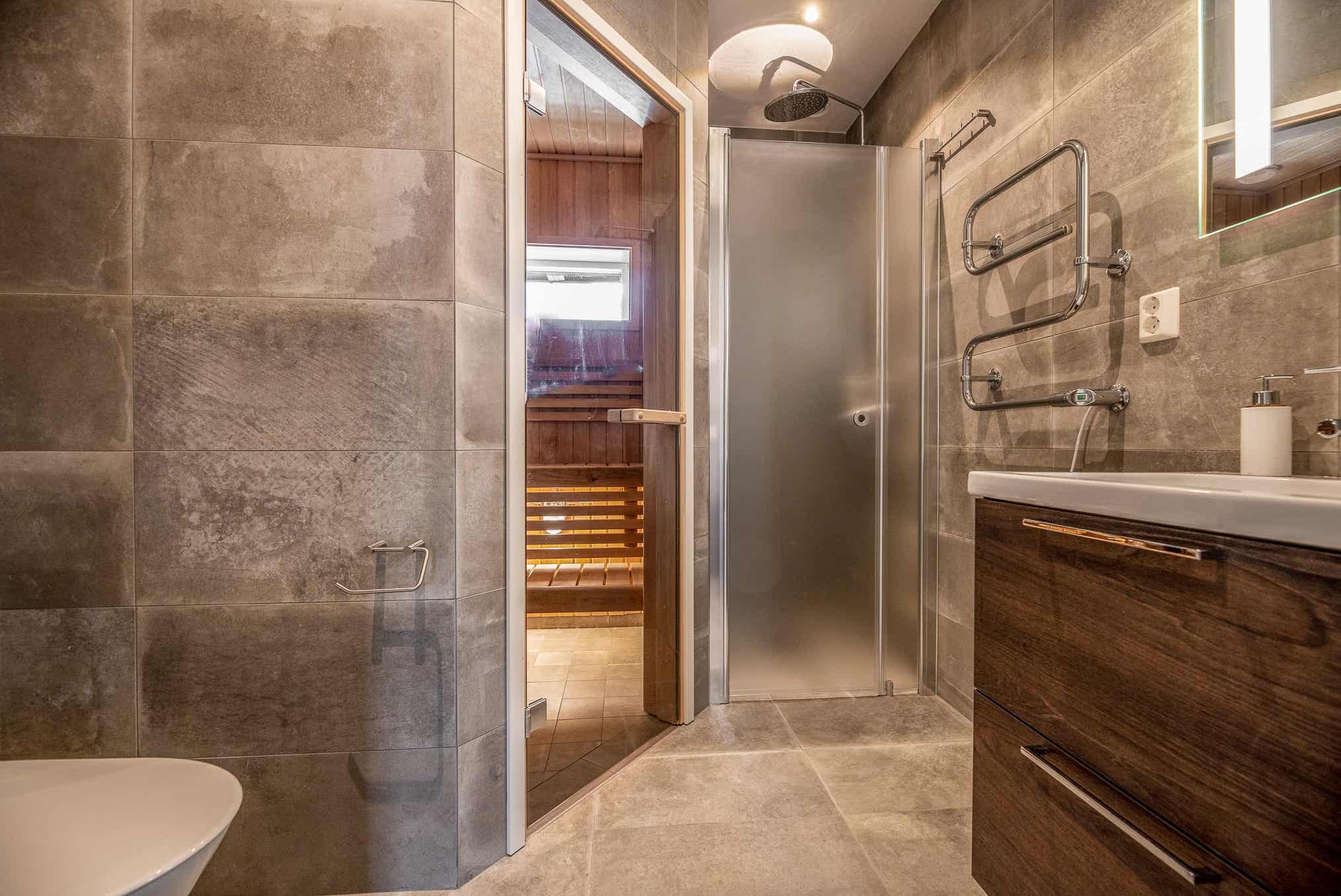 Badeværelset-1 = bruse/wc/sauna. Badeværelset-2 = bruse/wc.