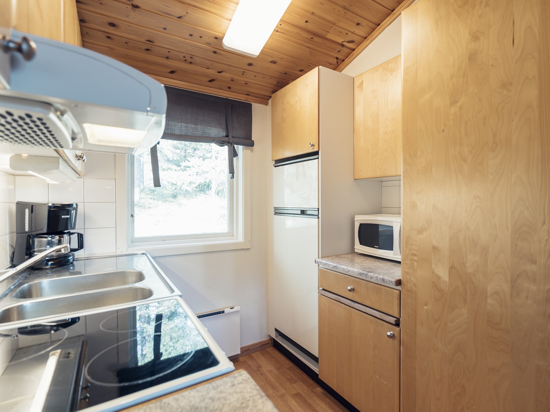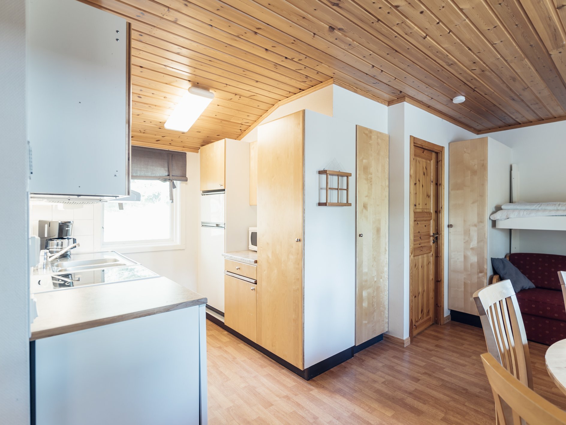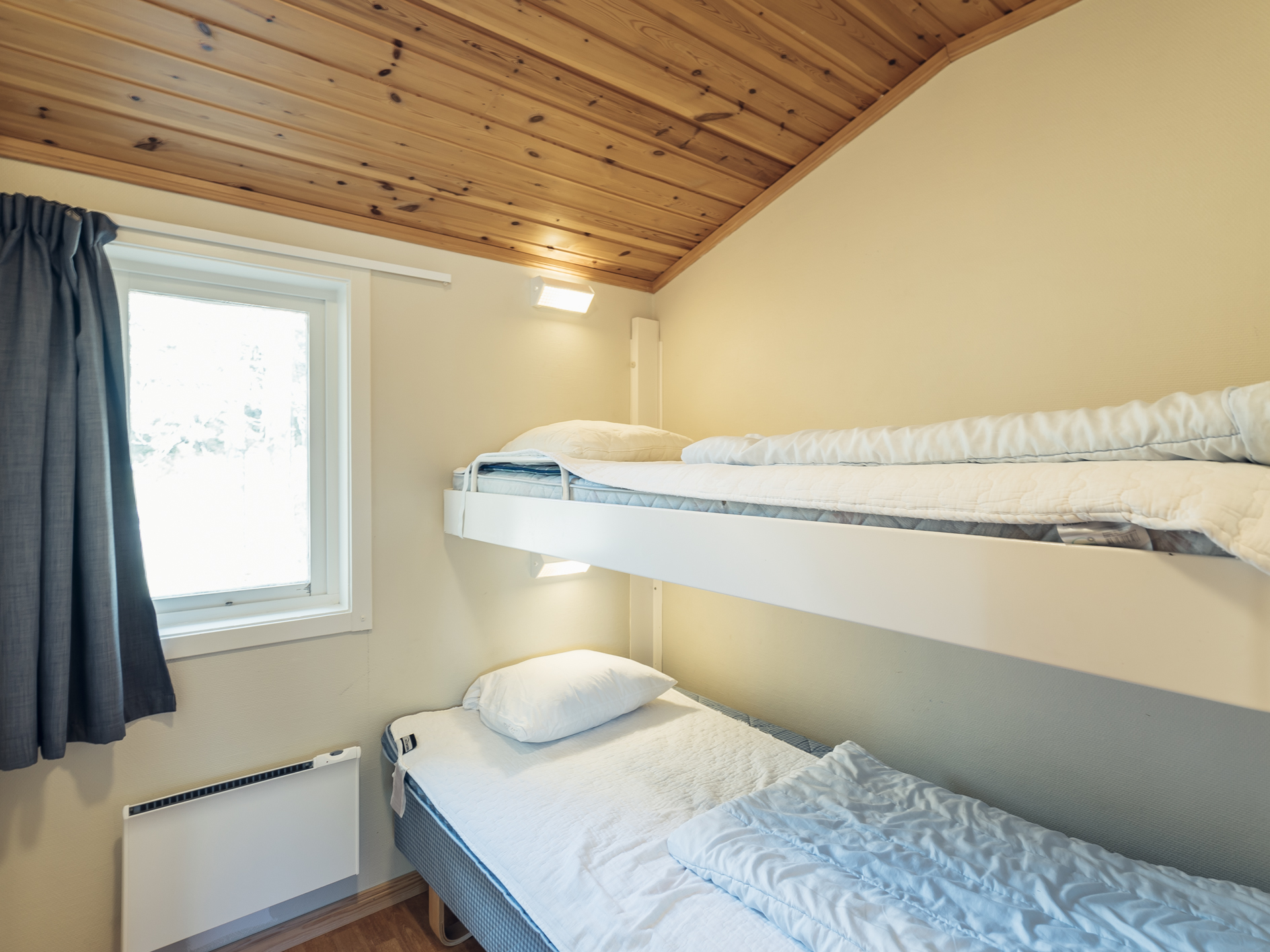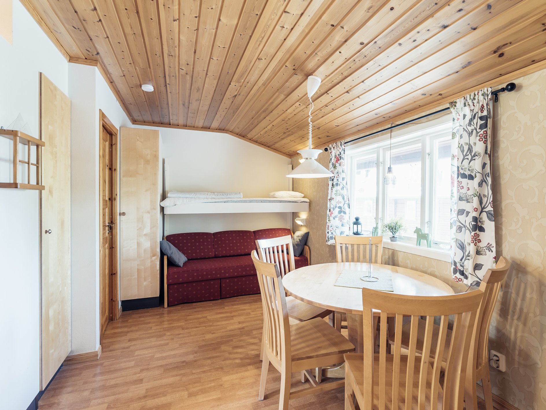 Mindre parhus i Skogsbyn med plats för upp till 5 personer. Här är det en öppen planlösning med köksavdelning, matplats, TV - hörna med bäddsoffa för 2 personer och en nedfällbar väggsäng. Sovrum 1 har en enkelsäng och en nedfällbar väggsäng. Torkskåp och motorvärmaruttag. Rökning och husdjur är ej tillåtet. Laddning av elbilar är endast tillåtet vid avsedda laddningsstolpar. Boendet håller en enklare standard.