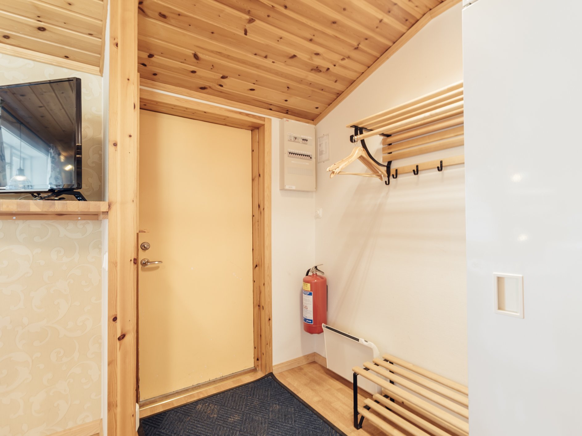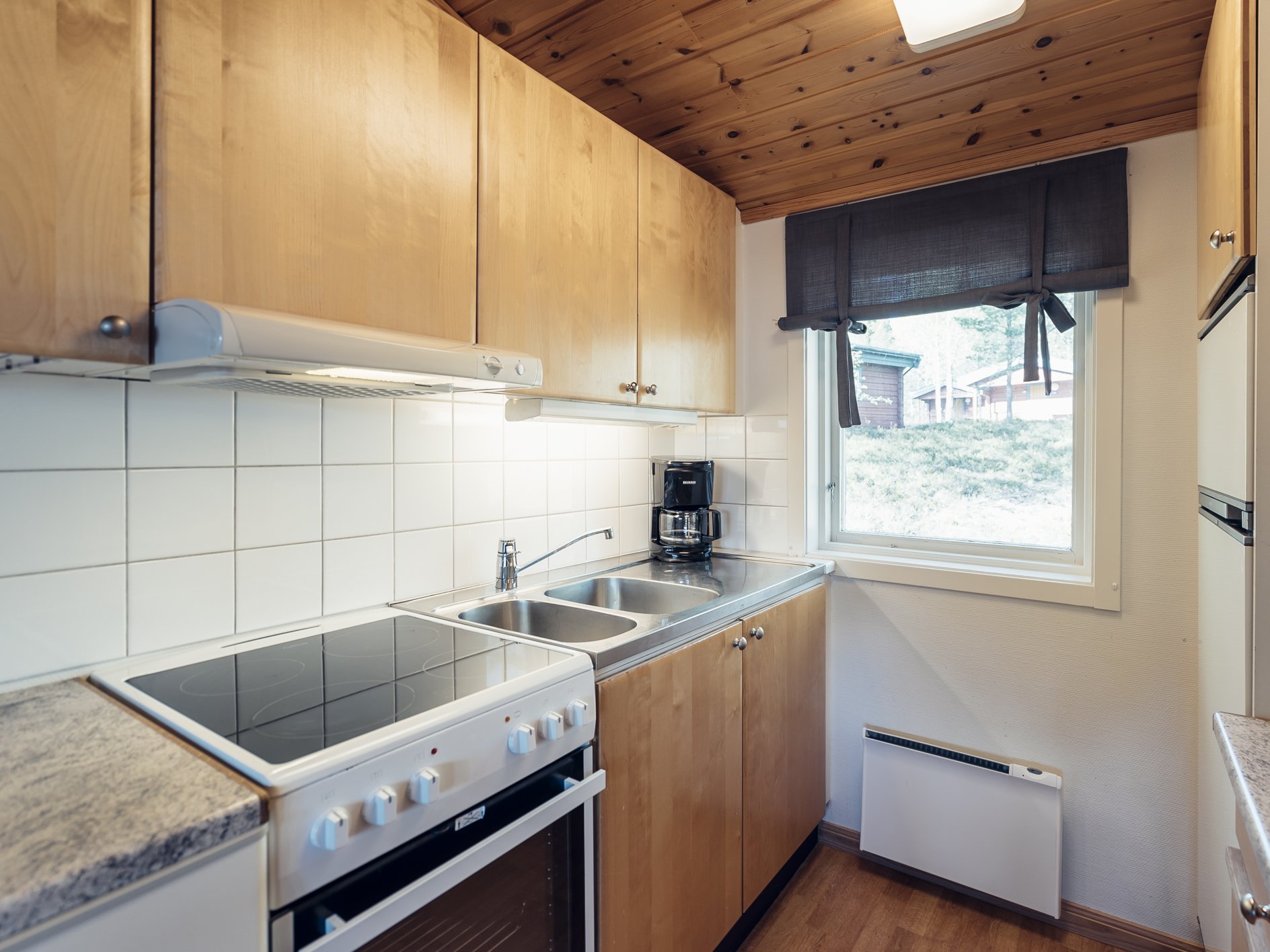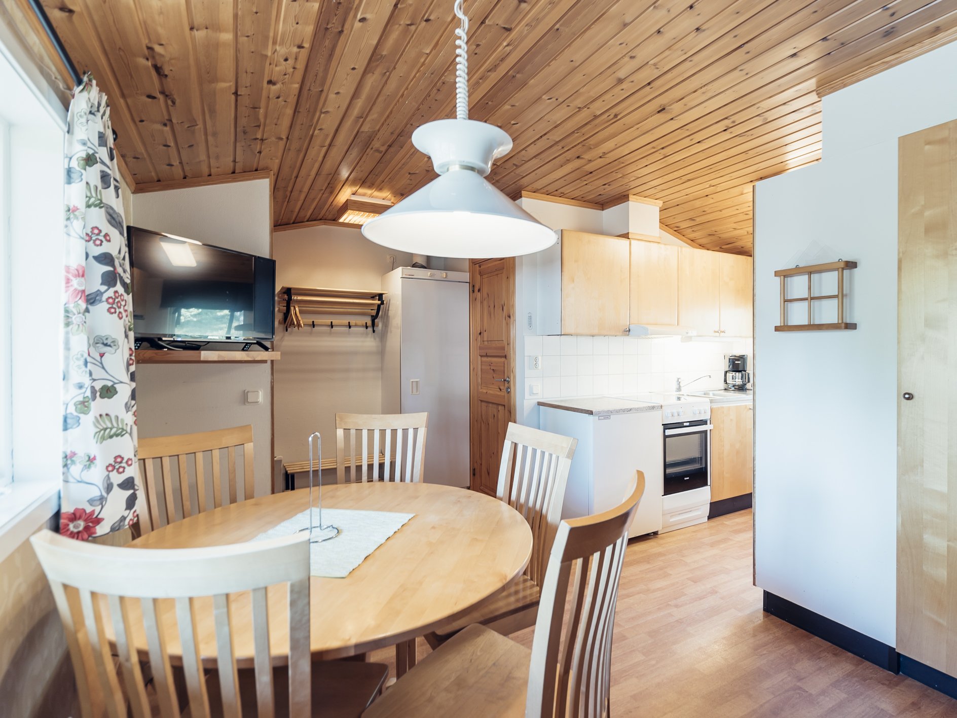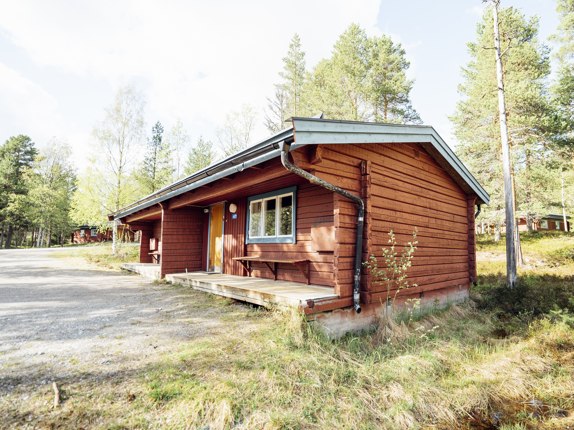 Mindre parhus i Skogsbyn med plats för upp till 5 personer. Här är det en öppen planlösning med köksavdelning, matplats, TV - hörna med bäddsoffa för 2 personer och en nedfällbar väggsäng. Sovrum 1 har en enkelsäng och en nedfällbar väggsäng. Torkskåp och motorvärmaruttag. Rökning och husdjur är ej tillåtet. Laddning av elbilar är endast tillåtet vid avsedda laddningsstolpar. Boendet håller en enklare standard.