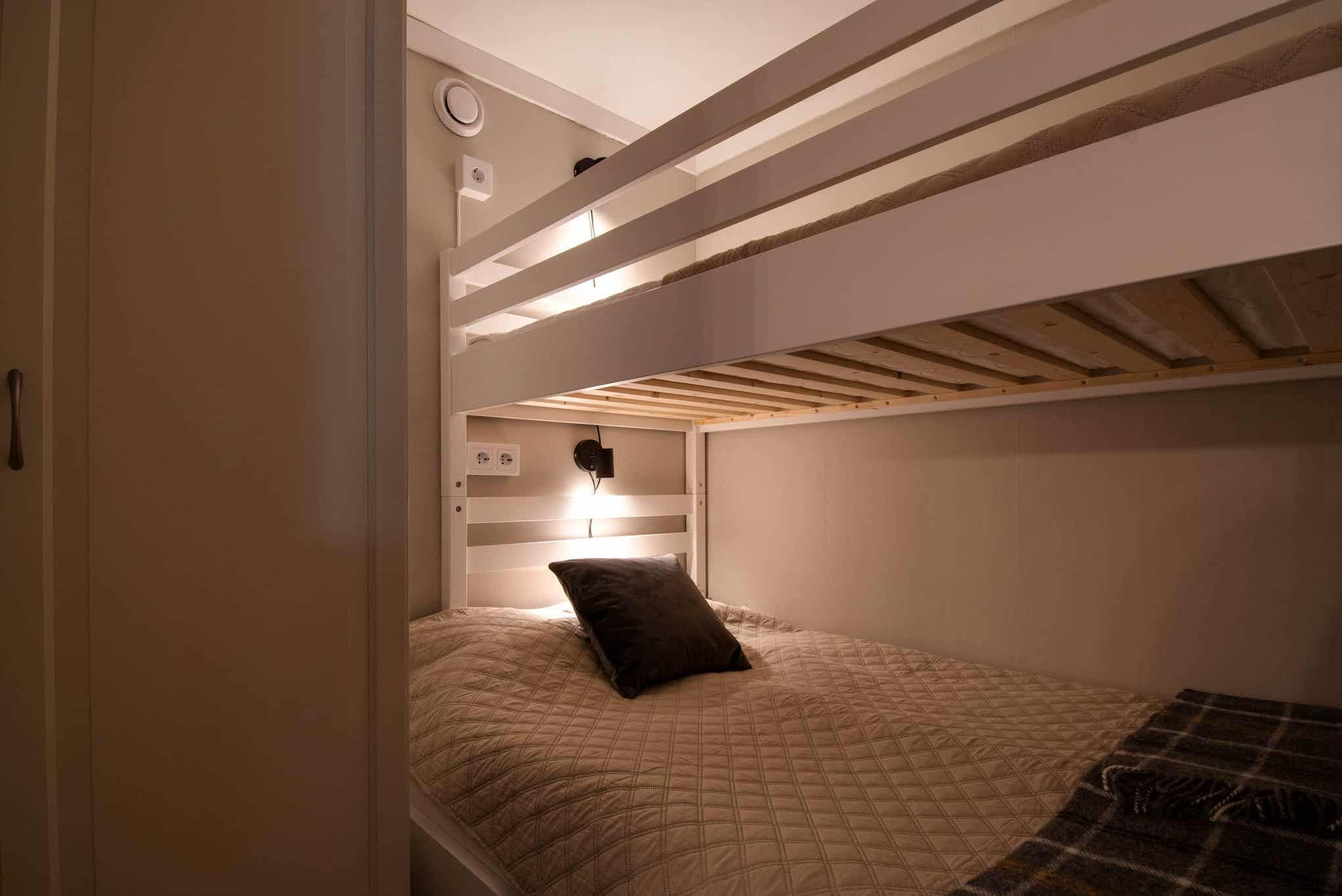 Alkove 1 =1 køjeseng med 120 cm bred underkøje og 90 cm bred overkøje.