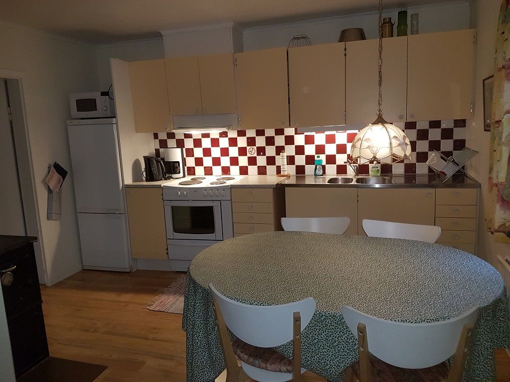 Kök med kyl/frys, spis/ugn samt en vedspis.