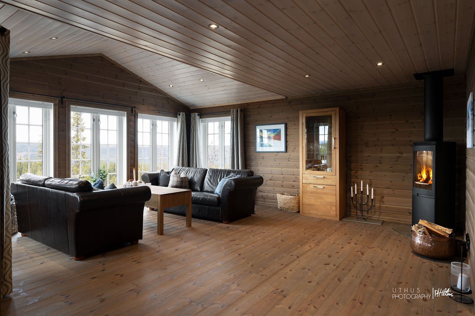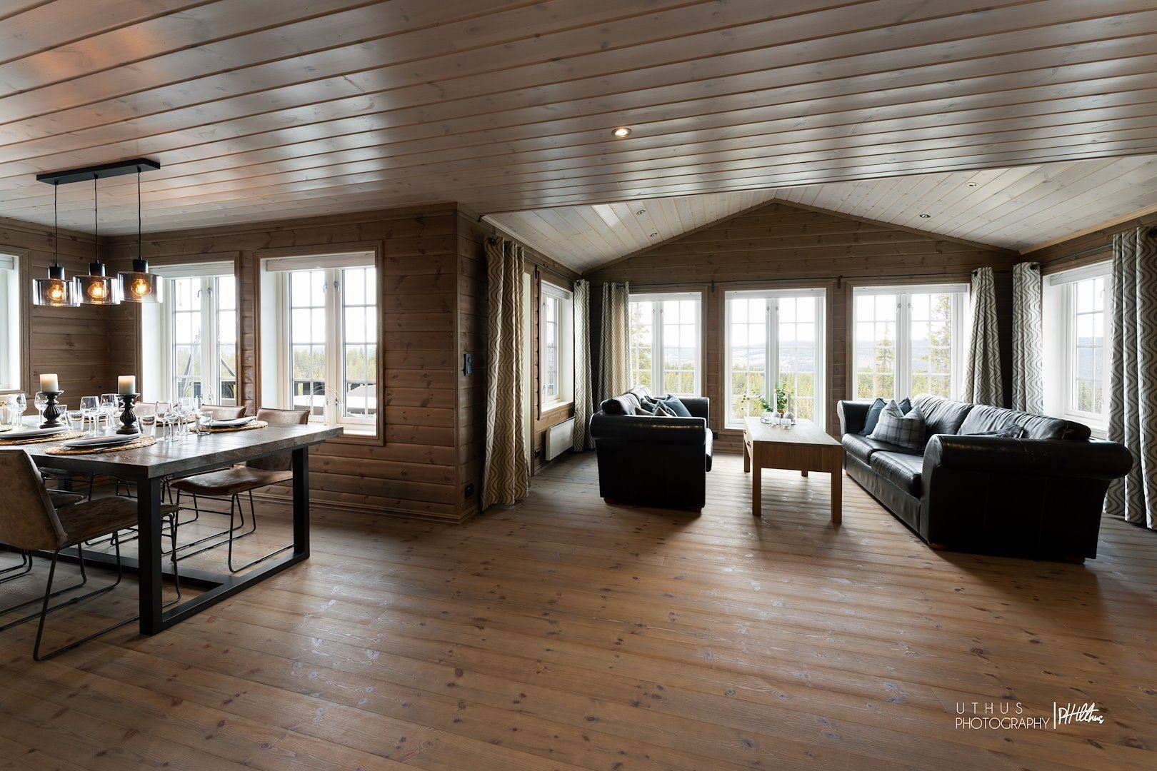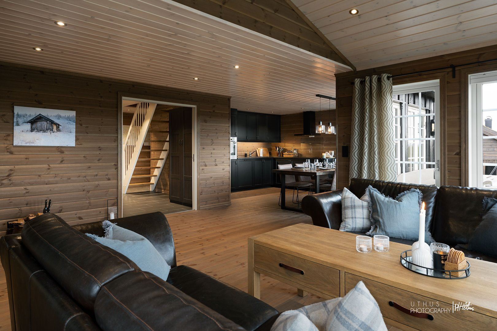 I 1.etg er det felles stue og kjøkken plass til 12 personer rundt spisebord. Romslig stue med store vinduer og god utsikt, samt peis. I 2. etg er det en TV-stue. Hytta inneholder to fullverdige bad, hvor det største også inkluderer badstue. På fremsiden av hytta er det en stor terrasse.