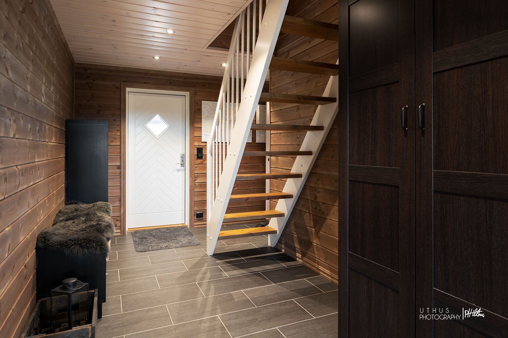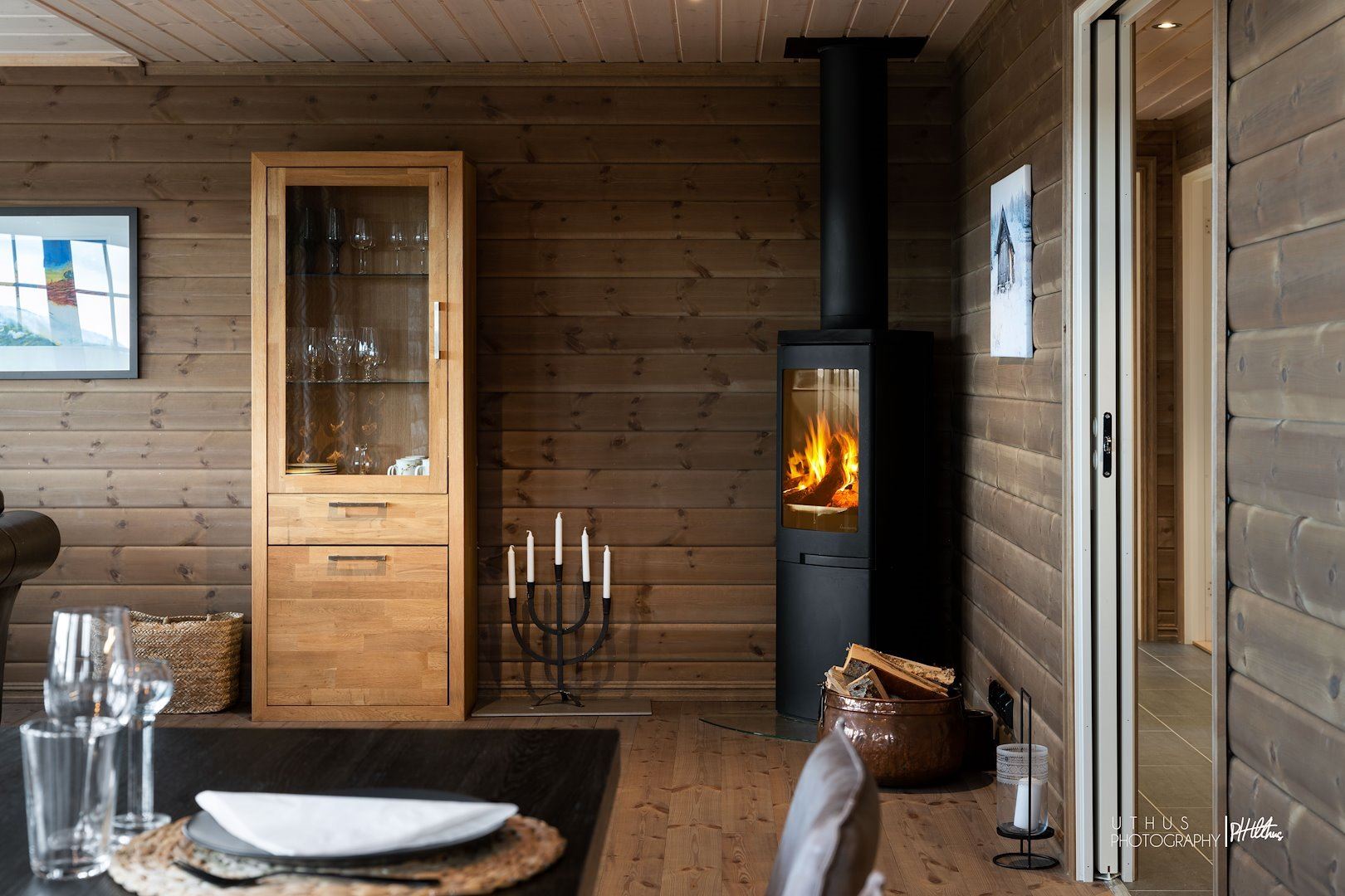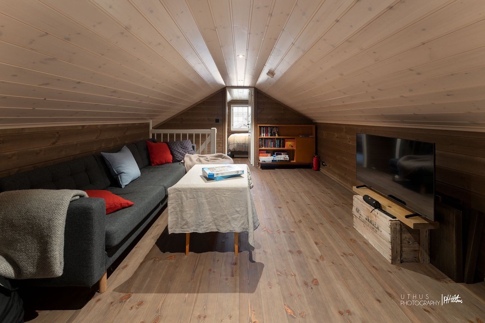 I 1.etg er det felles stue og kjøkken plass til 12 personer rundt spisebord. Romslig stue med store vinduer og god utsikt, samt peis. I 2. etg er det en TV-stue. Hytta inneholder to fullverdige bad, hvor det største også inkluderer badstue. På fremsiden av hytta er det en stor terrasse.