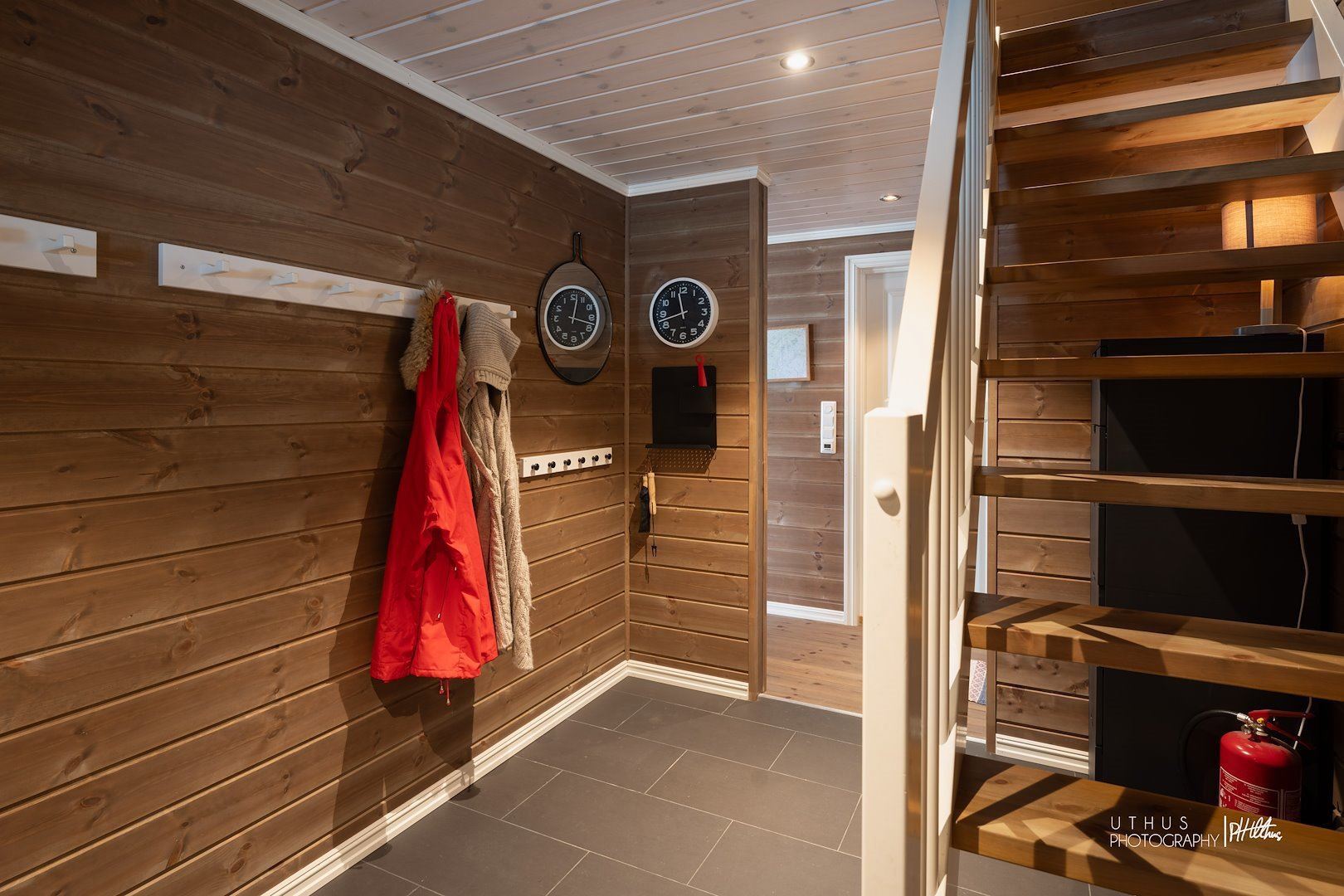 I 1.etg er det felles stue og kjøkken plass til 8 personer rundt spisebord. Romslig stue med store vinduer og god utsikt, samt peis. I 2. etg er det en TV-stue. Hytta inneholder ett fullverdig bad. På fremsiden av hytta er det en stor terrasse med bålpanne.