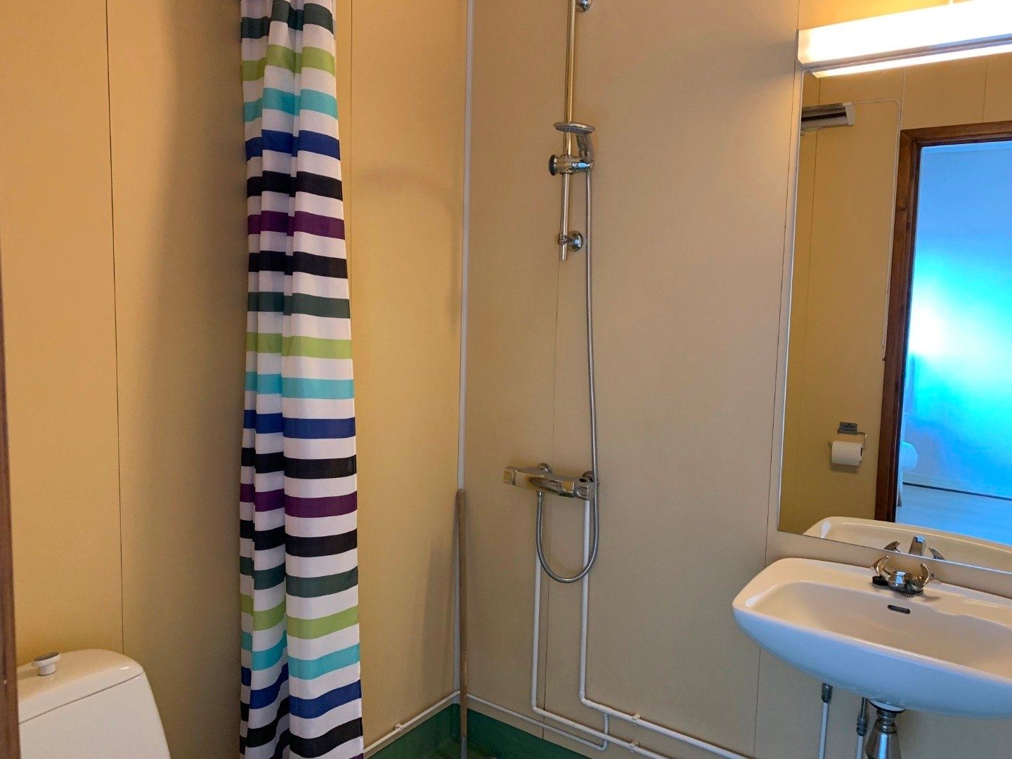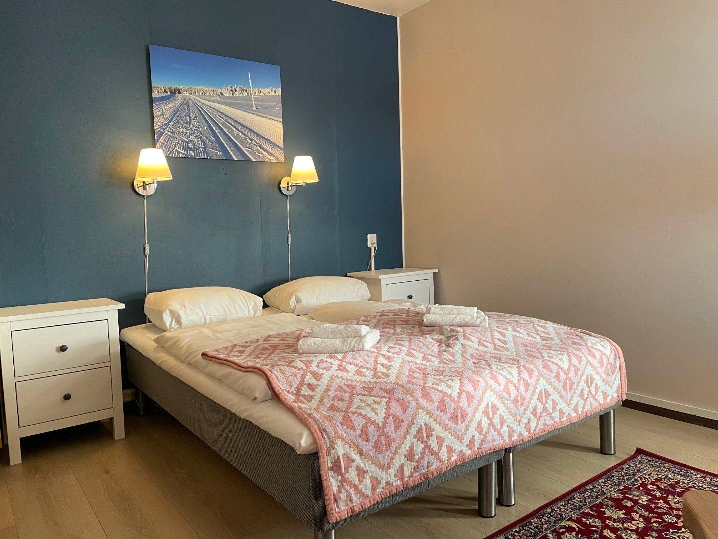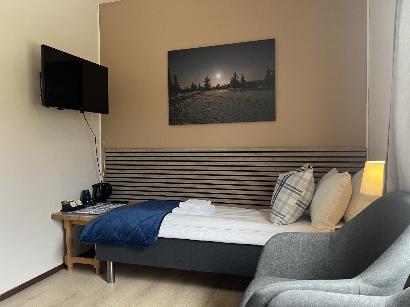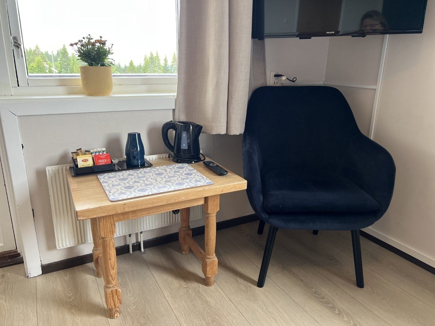 Ferdig oppredd dobbeltseng eller 2 enkle senger med 2 hodeputer, liten sittegruppe, TV, kaffe/tekoker, parkettgulv, dusj/toalett.