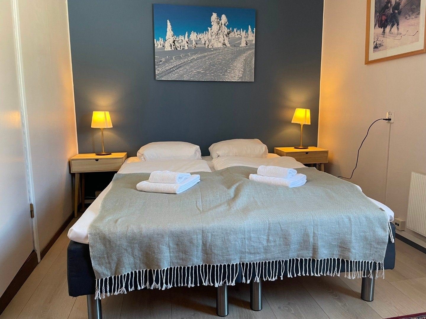 Det er ikke plass til ekstrasenger i våre dobbelt/twin rom, da må det bestilles familierom istedenfor.
